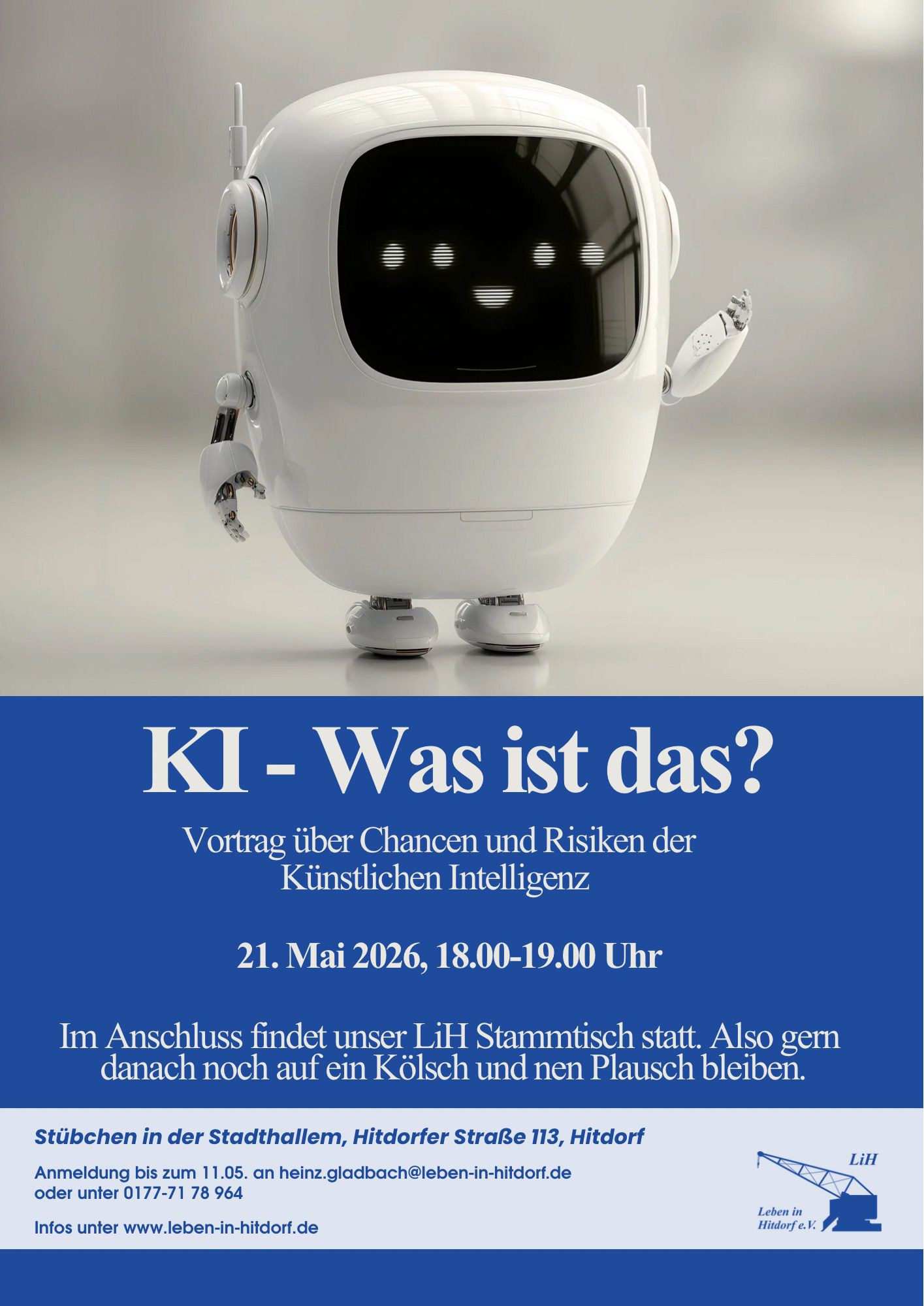 Dem Mai Stammtisch ist ein Vortrag zum Thema “künstliche Intelligenz” (18 – 19:00 Uhr) vorgeschaltet. Bitte hierzu die Anmeldung nicht vergessen.