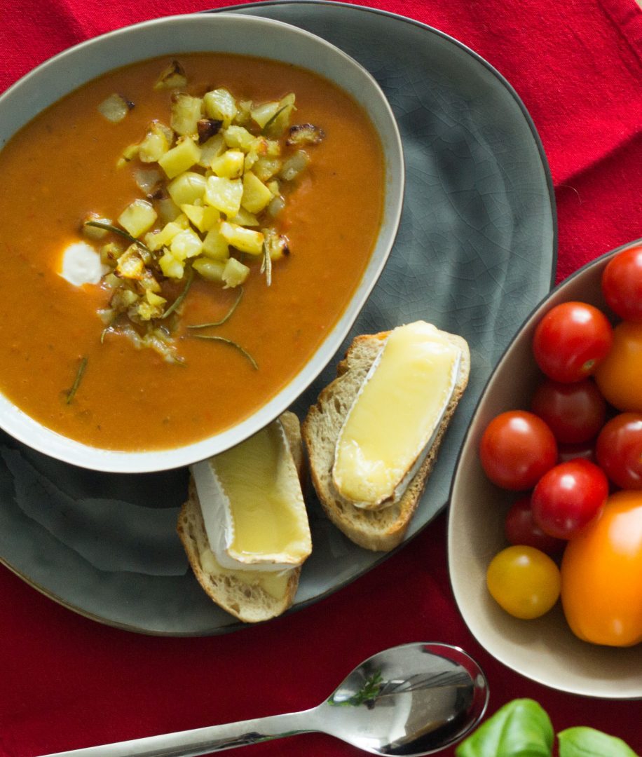 Tomaten-Paprika-Suppe mit Rosmarin-Kartoffel-Croûtons und gratiniertem Taleggio-Ciabatta